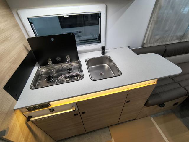 - Cucina Attrezzata: Include un grande frigorifero (circa 167 litri) , fornello a due fuochi e ampio spazio di lavoro.