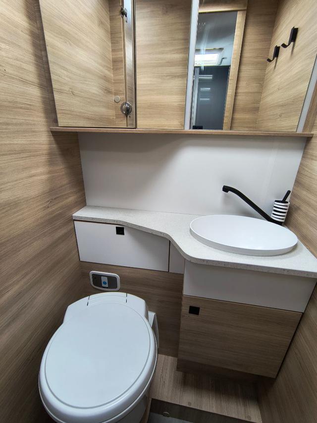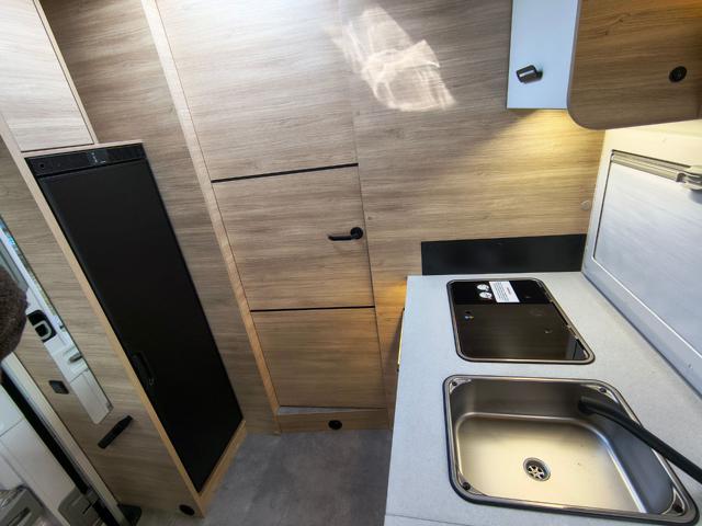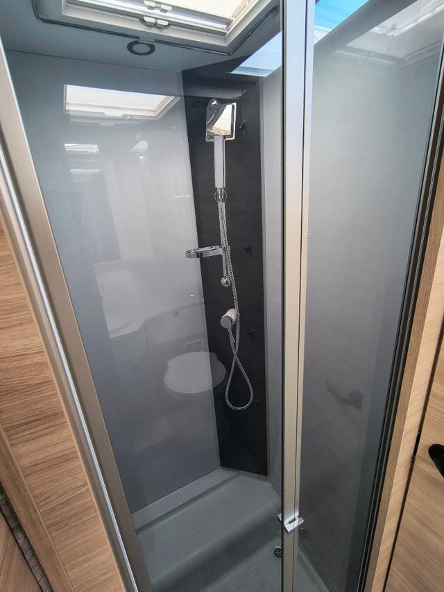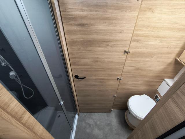 - Servizi: Bagno e box doccia sono rigorosamente separati sui due lati del veicolo. Le doppie porte consentono di isolare l'intera area posteriore, creando una vera e propria stanza da bagno e spogliatoio privata.