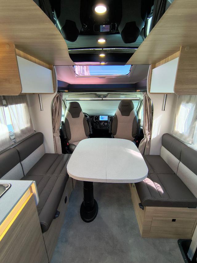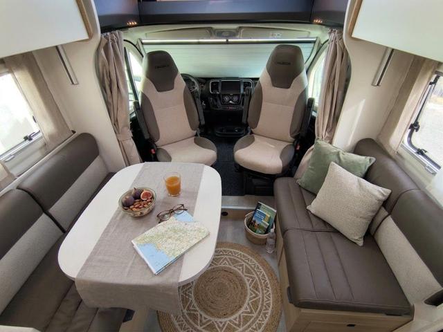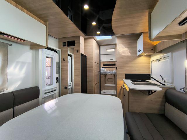 - Zona Giorno: Dinette "Face to Face" con divani contrapposti, per un ambiente arioso e conviviale. Nella parte superiore è integrato il letto basculante elettrico a discesa, che non va a ostruire l'ingresso quando abbassato.