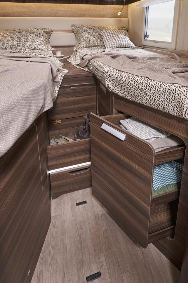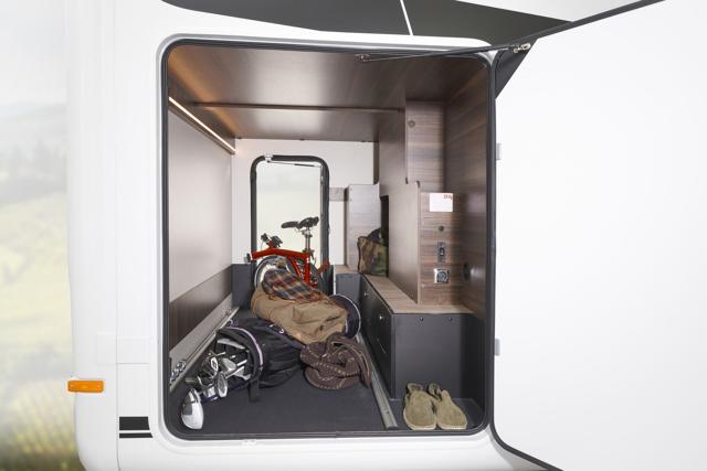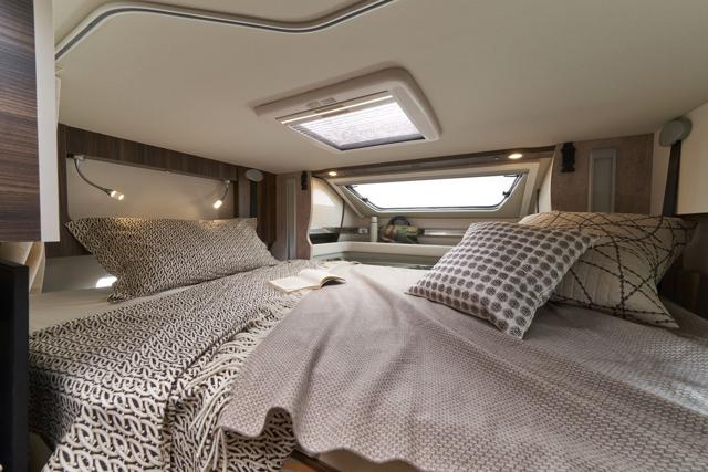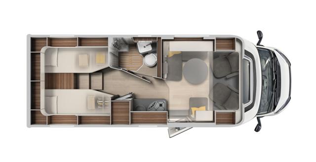 Layout interno molto ricercato con letti gemelli posteriori (unibili in un grande matrimoniale) sopra un ampio garage portamoto, e un letto basculante anteriore integrato nella zona giorno.